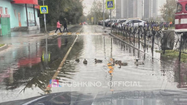 Жители подмосковного Пушкино заметили нескольких уток, переплывавших проезжую часть. Фото опубликовал Instagram-паблик pushkino_official.