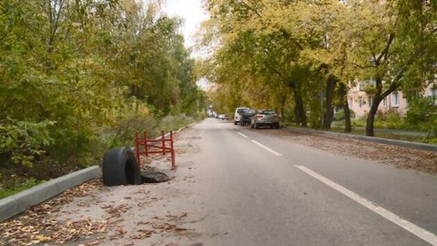 Провал на улице Дружбы занял треть полосы неширокой дороги, отремонтированной в 2019-м. В него помещается шина от грузовика - ее воткнули в яму, перед которой установили сигнальное ограждение, чтоб уж наверняка всем было видно и никто не влетел.