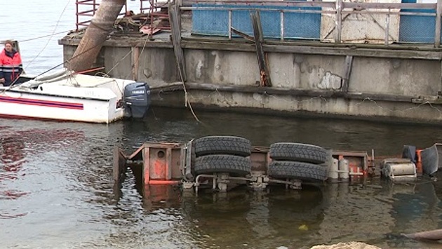 Грузовик перевернулся на бок, а «немец» полностью скрылся под водой.