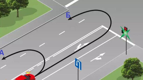 Тщательно рассмотрите изображение. Обратите внимание на дорожную разметку и знаки. Подумайте над ответом. А мы расскажем, как должен действовать водитель красной машины, чтобы совершить разворот и при этом не нарушить ПДД.