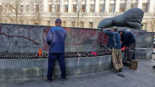 Фонтан со львами, который испортили граффити, начали чистить на площади Советов в Ростове