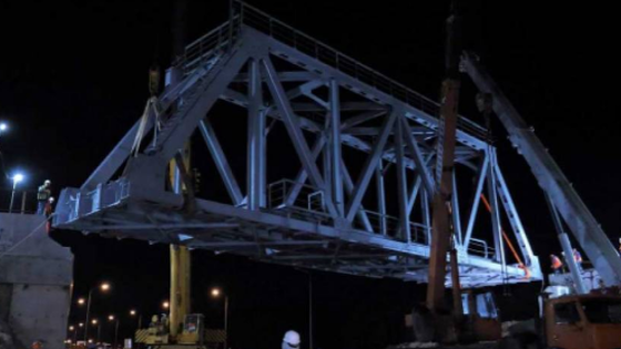 Для этого на участке Камышового шоссе пришлось ограничить движение транспортных средств. Сама конструкция была подготовлена заранее. Ее вес составлял 106 тонн, а длина – 33 метра. Установка путепровода у рабочих заняла примерно 30 минут – монтаж делали в воздухе при помощи двух кранов, которые были предоставлены Краснодарским краем.