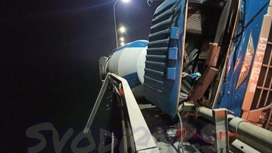 По словам очевидцев, большегруз-бетономешалка уходил от столкновения с другой машиной и влетел в леера. Водители не пострадали.