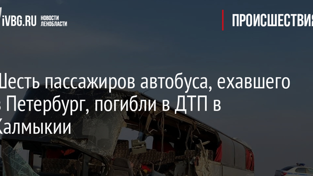 Сегодня ночью, 24 октября, на 254-м километре ФАД-216 "Астрахань — Элиста — Ставрополь" произошло смертельное ДТП с участием автобуса, ехавшего в Петербург. Лоб в лоб столкнулись пассажирский автобус «Неоплан», следовавший из Махачкалы в Петербург, и грузовой автомобиль «КАМАЗ». Фото: СУ СК России по Республике Калмыкия По предварительной информации, погибли шесть человек, в их числе один ребенок. Еще восемь человек получили травмы разной степени тяжести. Всего в автобусе ехало 28 пассажиров. Сейчас на месте работают экстренные службы. Следком возбудил уголовное дело по факту ДТП в Калмыкии.