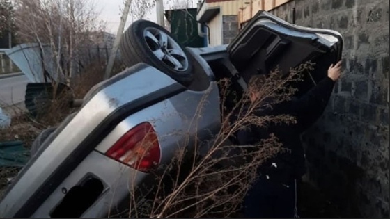 На снимках видно, что машина лежит на крыше, опираясь на расположенную рядом стену. По словам очевидца, причиной автоаварии послужило лопнувшее у автомобиля колесо.