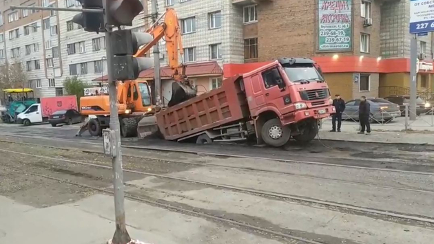 Грузовик провалился под новый асфальт в Новосибирске