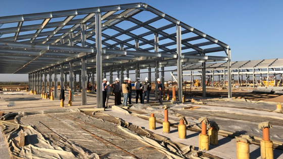 На площадке работают 266 человек и 29 единиц техники. В настоящее время строители занимаются сборкой конструкций. В семи корпусах из 13-ти завершили установку наружных стен из сэндвич-панелей и кровли. Рабочие монтируют внутренние сети электроснабжения, вентиляции. Начали возведением внутренних перегородок и потолка.
