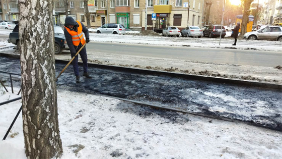 В первый день после ковидных «каникул» в Новосибирске возобновили недоделанные работы на тротуаре по улице Блюхера. Рабочие расчищают снег и наледь механическим путем, вручную и техникой, а также с помощью химии. Рядом стоит каток, готовый продолжить укладку асфальта вопреки зимним погодным условиям.