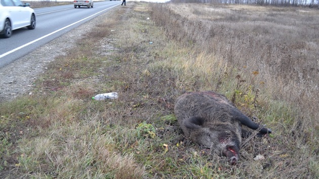 Животное сбил грузовик у пруда возле села Красное. Водитель автомобиля говорит, что кабана не заметил, почувствовал только резкий удар. Остановившись, обнаружил оторванный бампер.