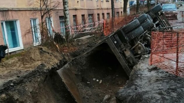 Необычное ДТП произошло сегодня во дворе дома № 12 на улице Шотмана. Фото инцидента была опубликованы в группе «ДТП Петрозаводска и Карелии». На снимках видно, что груженый песком самосвал упал в строительную яму, вырытую для прокладки сетей к новому дому. Как позже выяснилось, под машиной провалилась земля. ГИБДД вызвали жильцы дома. По информации ГИБДД, водитель грузовика во время инцидента не пострадал.
