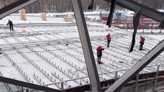 Параллельно продолжается монтаж фальцевой кровли и фасадов, остекление витражных систем на основной арене, заливка монолитных гребенок и лестниц, монтаж металлических конструкции фасада основной арены. Завершается установка оборудования индивидуального теплового пункта. Также рабочие оборудуют ходовые мосты в верхней части купола здания.