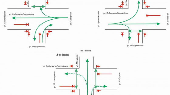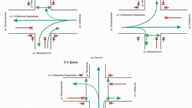 1 фаза – движение транспорта по ул. Сибиряков – Гвардейцев от ул. Соборная, движение транспорта по ул. Мичурина (с доп. секцией направо) и пешеходный переход через ул. Мичурина по чётной стороне; 2 фаза – движение транспорта по ул. Сибиряков – Гвардейцев от ул. Пролетарская и пешеходный переход через ул. Мичурина по нечётной стороне; 3 фаза – движение транспорта по ул. Мичурина и пешеходный переход через ул. Сибиряков – Гвардейцев.