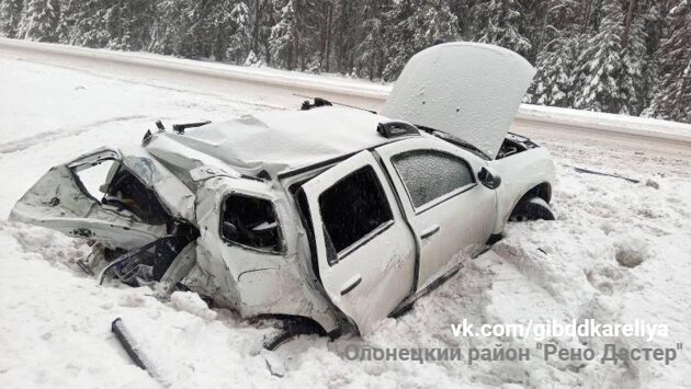 Кроссовер превратился в металлолом после ДТП на трассе «Кола». Водитель автомобиля «Renault Duster» врезался в грузовик «Урал» на встречной полосе. Об этом сообщили в ГИБДД. Авария произошла вчера, 13 декабря, в 12:30 на 295 км трассы «Кола» в Олонецком районе. При выполнении обгона водитель кроссовера потерял контроль над машиной и допустил занос. автомобиль выехал на встречку, где столкнулся с грузовиком «Урал». Пострадали двое – 42-летний водитель и 46-летний пассажир кроссовера. Обстоятельства ДТП выясняются.
