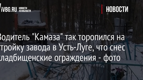 Водитель "Камаза" так торопился на стройку завода в Усть-Луге, что снес кладбищенские ограждения - фото
