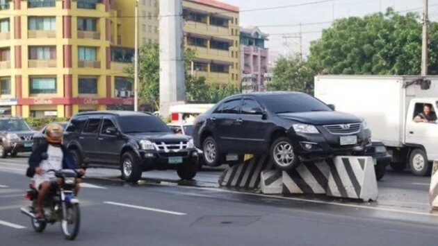 Наверно, он решил, что машины умеют плавать, но до воды так и не добрался. Иначе, как объяснить, что произошло на этом фото?