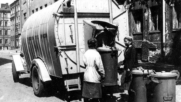 В 1949 году в Ленинграде появился мусоровоз необычной конструкции на основании немецкого патента. Внутри стоял внушительный шнек для перемалывания содержимого на манер мясорубки. Для разгрузки включался режим реверса.