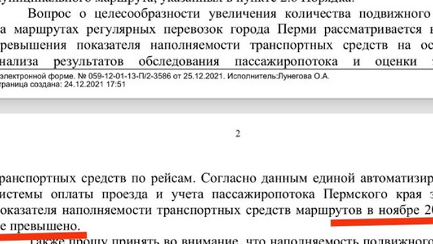 Пользователь соцсети рассказывает, что из-за ежедневной давки в автобусах он решил обратиться в департамент транспорта Перми, чтобы попросить увеличить количество транспорта для разгрузки пассажиропотока. Там ему ответили, что рассматривают вопрос об увеличении количества подвижного состава только в случае превышения показателей наполняемости транспорта, чего в ноябре 2021 года не было.