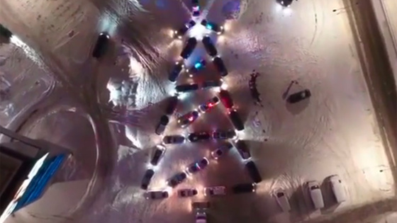Необычная инсталляция украсила парковку одного из торговых центров города. Все машины мигали красными и синими сигнальными огнями. Таким образом сотрудники Госавтоинспекции и представители общественных автосообществ решили поздравить жителей с наступающим Новым годом.
