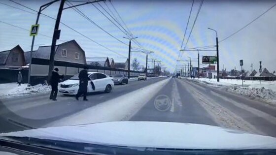 Мужчина и женщина, стоящие на обочине, начинают переходить проезжую часть. Они едва не попадают под колеса машины, водитель которой едет в направлении аэропорта. Автомобилист, видимо, решил не сбрасывать скорость перед зеброй. Он чудом не наезжает на людей, в последний момент выворачивая руль.