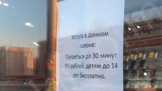 Объявление об этом повесили на двери одного из салонов сотовой связи. Погреться до 30 минут стоит 99 рублей. Детей до 14 лет запустят в салон бесплатно.