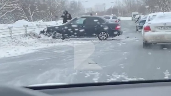 Автомобиль "Лада Приора" врезался в отбойник. Судя по всему, машину занесло на трассе и водитель потерял управление.