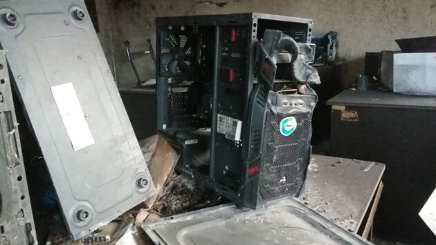 В офисе разбиты окна, на некоторых отверстия от пуль. В помещениях сильно пахнет гарью. Внутри, вероятно, все громили огнетушителями. В офисе все выгорело дотла. Мониторы, клавиатуры оплавлены, на многих компьютерах отсутствуют жесткие диски. Техника восстановлению не подлежит.