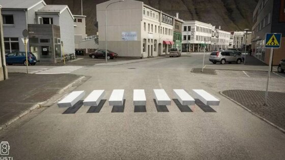 Инновационный метод размещения пешеходных переходов был использован в датском городке Орхус. Здесь «зебру» нарисовали в ЗD технике. Перед взором водителя появляются зависшие над дорожным полотном блоки.