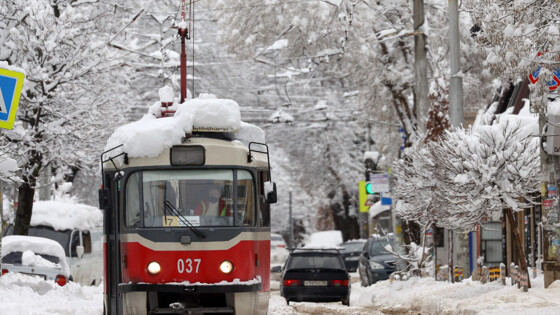 Мощные осадки: ливни, мокрый снег с грозой, град и ветер до 29 метров в секунду. На юге России режим повышенной готовности в 34 районах. Города-курорты завалены снегом. В Краснодаре пассажиры толкают троллейбус, он застрял на трамвайных путях из-за снежной каши.