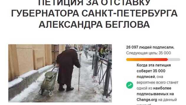 По состоянию на утро 24 января петиция за отставку губернатора Санкт-Петербурга Александра Беглова собрала свыше 26 тыс. подписей. Но в интервью СМИ Беглов заявил, что свой пост он не собирается покидать. Причиной требования жителей Петербурга по отставке Беглова с поста главы города, стала катастрофическая ситуация с уборкой города от снега и наледи. С начала зимы чиновники Смольного во главе с Бегловым не могут наладить эффективные работы по расчистке дорог и улиц. В результате, в городе в разы выросло количество ДТП, а также обращения горожан в поликлиники из-за полученных травм при падении на скользких тротуарах. «Ввиду текущей ситуации с уборкой снега в центре и спальных районах терпеть это безобразное отношение больше не можем!» — написали авторы петиции в своем обращении. Накануне в ходе своего интервью на ТВ, Беглов заявил, что намерен и дальше продолжать работу на посту градоначальника. Он в очередной раз принес извинения «за неудобства», попросил «потерпеть», и заверил горожан, что «доведет реформы до конца и сделает город чище и лучше». С конца ноября критика в адрес Смольного и Беглова приняла масштабный характер, а ситуация с неубранным Петербургом стала систематической. По оценкам экспертов, чиновники администрации рассчитывали на малоснежную зиму, и не подготовились как следует к сезону.