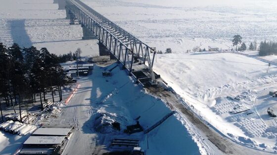Первый и второй пролёты рабочие возвели летом прошлого года. Третий пролёт завершили минувшей осенью. По словам министра транспорта Красноярского края Константина Димитрова, объект готов на 55%. К концу 2022 года работы достигнут 85% отметки. Морозы никак этому не помешают.