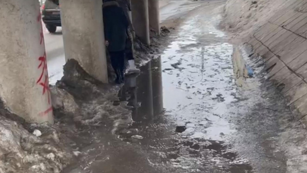 По словам автор поста, пешеходы вынуждены пробираться ползком, потому что мост не расчищают, и вся воды стекает прямо на тротуар, в результате чего появилась огромная лужа.