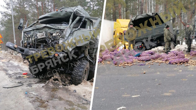 В Брянской области перед поворотом на Злынку произошла авария с участием грузового и военного автомобилей. Кадры последствий ДТП очевидцы опубликовали в социальных сетях. В результате столкновения грузовики вылетели в кювет, техника получила сильные повреждения. Часть груза, который перевозила фура, оказалась по проезжей части. В ролике слева на обочине виден искореженный "КамАЗ" в камуфляжной раскраске, справа можно заметить желтую кабину фуры, рядом с которой стоит еще один разбитый грузовик. Очевидцы сообщили, что в аварии пострадали двое военных, их якобы отправили в больницу Новозыбкова. На месте работают сотрудники оперативных служб. Официальной информации о причинах аварии и пострадавших пока нет. Ранее сообщалось, что в Крыму бронетранспортер протаранил автомобиль Lada, а в Красноярске спешившую на учебу студентку сбил автомобиль.