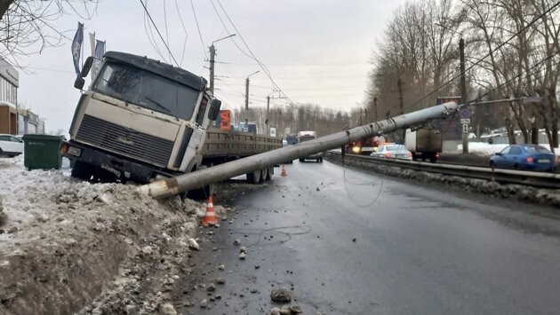 Днем, 18 февраля, в Кирове на ул. Производственной водитель автомобиля МАЗ с полуприцепом въехал в опору линий электропередач.