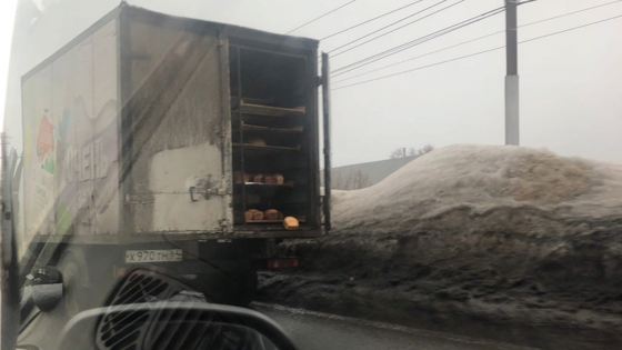 Надороге вСаратове автомобилист Артем Мернаев заметил грузовую машину, изкузова которой выпадают буханки хлеба. Фото происшествия очевидец опубликовал вгруппе «Типичный Саратов» ВКонтакте.