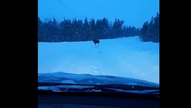 На кадрах можно увидеть, как молодой лось движется перед автомобилем, не обращая внимания ни на окрики, ни на предупреждающие автомобильные гудки. Даже когда водитель, выйдя из машины, попытался напугать животное собакой, выяснилось, что лось не из пугливых. И устав бежать, сохатый останавливался отдохнуть, но проезжую часть не покидал.
