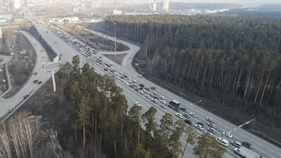 С самого утра 13 апреля жители отдаленных районов Екатеринбурга встали в километровую пробку на Щербакова и на Объездной автодороге из-за ремонта моста на Кольцовской развязке. Редакция URA.RU решила посмотреть на вяло движущийся поток с высоты птичьего полета.