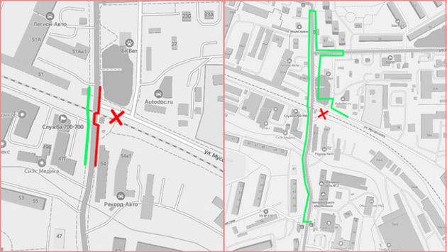 Теперь люди упираются в забор из профнастила. Железнодорожники дополнительно огородили проход плёнкой, убрали дорожку через рельсы и повесили объявления о запрете. Люди ожидаемо игнорируют и даже несколько раз делали дыру в заборе. Альтернатива — двигаться вдоль проезжей части по соседству с легковушками, грузовиками и автобусами.