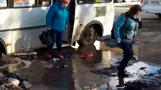 Общественный транспорт остановился на дороге на улице Урицкого. Жителям российского города пришлось прыгать через грязную лужу, чтобы выбраться из транспорта. На кадрах также можно заметить разбросанный вокруг ямы мусор.