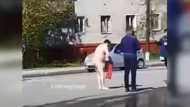 На кадрах можно заметить, как на дороге стоит мужчина, абсолютно голый, и держит в руках красные шорты. Также он размахивал ими, после чего попытался надеть.