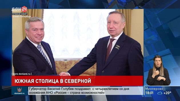 Ростовская область, 20 мая 2022. Телеканал «ДОН 24». Василий Голубев встретился с губернатором Санкт-Петербурга Александром Бегловым. Главы регионов обсудили вопросы взаимодействия южной и северной столиц, и донской губернатор предложил провести дни культуры Ростовской области в городе на Неве. Предполагается, что наш край в культурной столице России представят лучшие творческие коллективы – ансамбль песни и пляски донских казаков имени Анатолия Квасова, Ростовский академический симфонический оркестр, артисты музыкального театра и театра драмы имени Горького. Также губернаторы договорились о подготовке новой дорожной карты по выполнению соглашений между Донским регионом и Северной Пальмирой.
