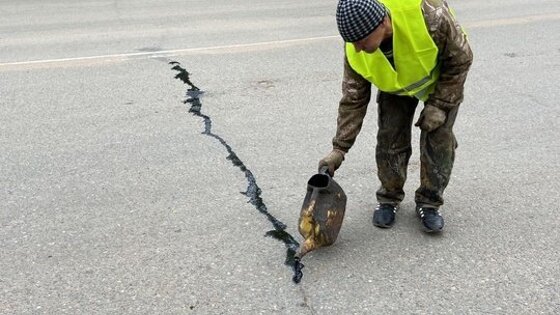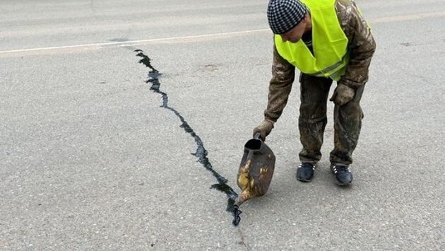 В Кирово-Чепецке начали заливать из лейки трещины в асфальте