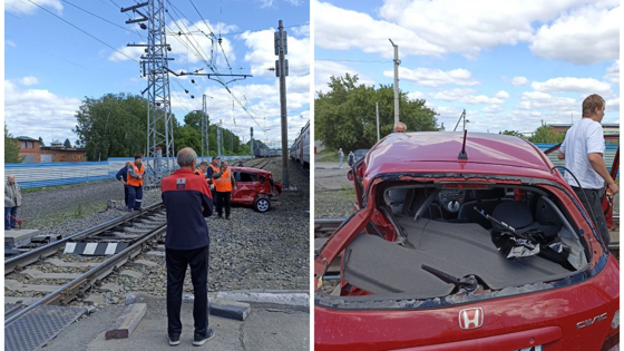 Электричка, направляющаяся из Новосибирска в Искитим, врезалась в легковой автомобиль Honda Civic. От удара машину отнесло на рельсы соседнего пути.