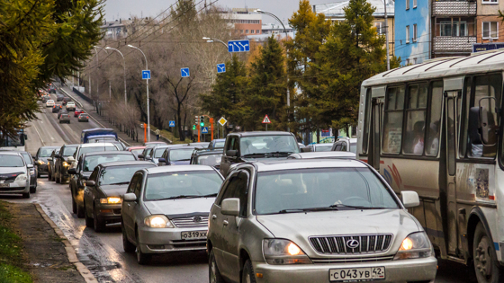 Большие заторы образовались на дорогах Кемерова в вечернее время. Движение затруднено в Центральном районе города.