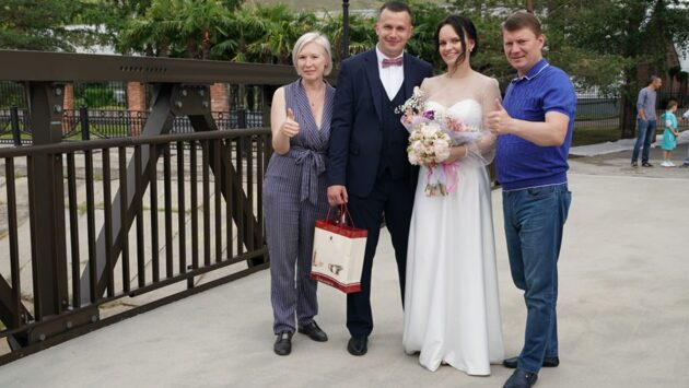 Глава Красноярска Сергей Ерёмин рассказал, что по давней свадебной традиции, жених Андрей перенёс свою невесту Кристину через мост, а после они устроили фотосессию в Юдинском саду.