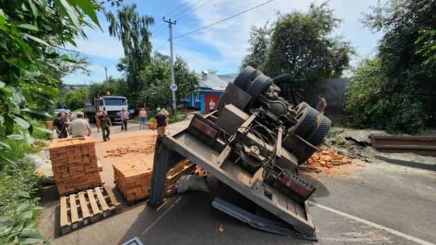 В Курске на ул.Бурцевка опрокинулся КАМАЗ с кирпичами