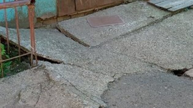 На асфальте образовались огромные трещины. А бетонные плиты, которыми сделаны тротуары, выпали и накренились. В соседнем доме расположена управляющая компания, но они бездействуют.