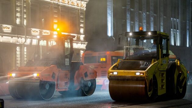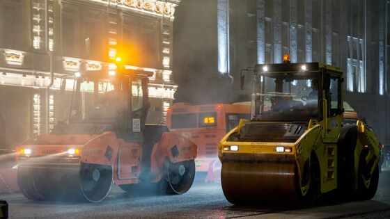 Готовность проезжей части в данный момент составляет около 70%. Подрядчик ремонтирует тротуары и укладывает новый бортовой камень, который также готов на 70%. На следующей неделе начнется укладка брусчатки. Все работы производятся ночью: начинаются в 10 часов вечера и заканчиваются в 4-5 часов утра, чтобы к моменту начала движения основного потока машин и автобусов асфальт успел остыть и не появилась колея.