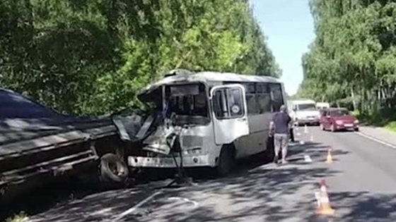 На кадрах видно лежащую в кювете фуру. В результате ДТП автобус получил значительные повреждения — у него смят капот, также выбиты стекла.