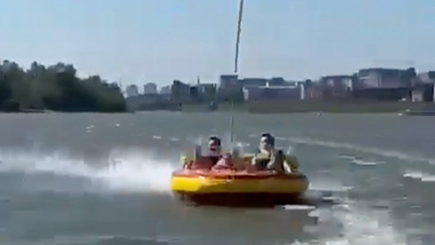 На них видно, как тюбинг, прицепленный тросом к лодке, отъезжает от берега реки. Затем лодка разгоняется и катает людей на тюбинге по водной глади. В какой-то момент в них на полной скорости влетает гидроцикл — из-за столкновения из тюбинга вылетает один человек.