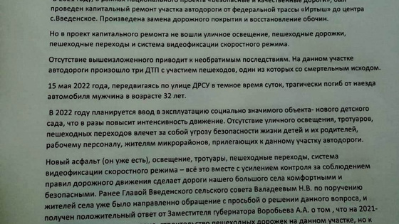 Жители направили губернатору Шумкову обращение. В нем говорится, что строительство пешеходных дорожек было запланировано на 2021—2022 гг., но работы до сих пор не начаты. По словам курганцев, из-за отсутствия освещения и пешеходных переходов 15 мая в темное время суток в ДТП погиб пешеход.